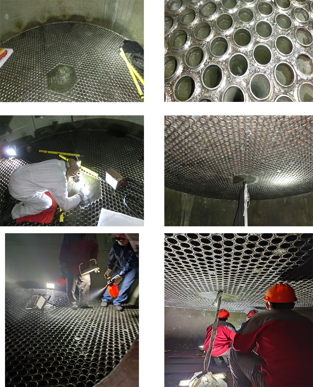 国内某上市化工集团公司精细化工项目,一台大型镍基特材换热反应器(NO6600),在使用中产生泄漏造成停车停产,经过多次维修泄漏问题仍然存在,在与我方经过多次的技术交流沟通,采用整体在线维修,从而在根本上一次解决泄漏问题,避免反复的停车维修,经过整体维修后一次开车成功,设备运行良好稳定,从而为业主从根本上解决反复停车维修难题,既解决了设备问题,又节约了更换成本,同时又保证了设备的安全运行和生产。