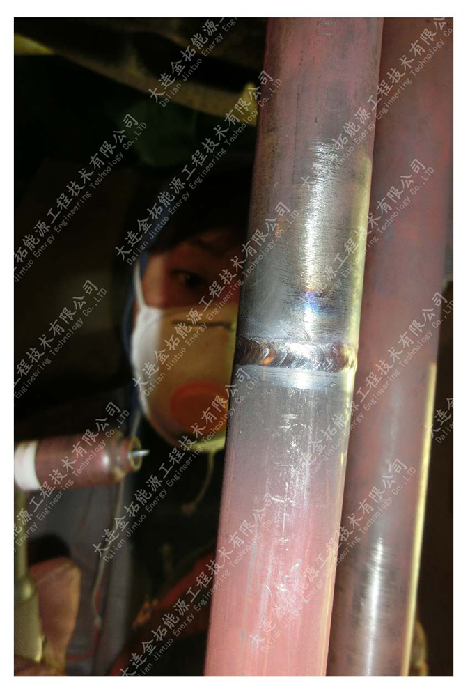 尿素汽提塔塔内的腐蚀,主要表现在汽提塔上部汽提管的冲刷腐蚀,冲刷腐蚀严重的部位主要集中在换热列管上管板到1.2米左右处之间,针对这一问题普遍采用局部更换列管,截除减薄区,重新对接一段列管并进行焊接,为了保证列管对接内壁的光滑度,对管子的内壁进行自动焊接。